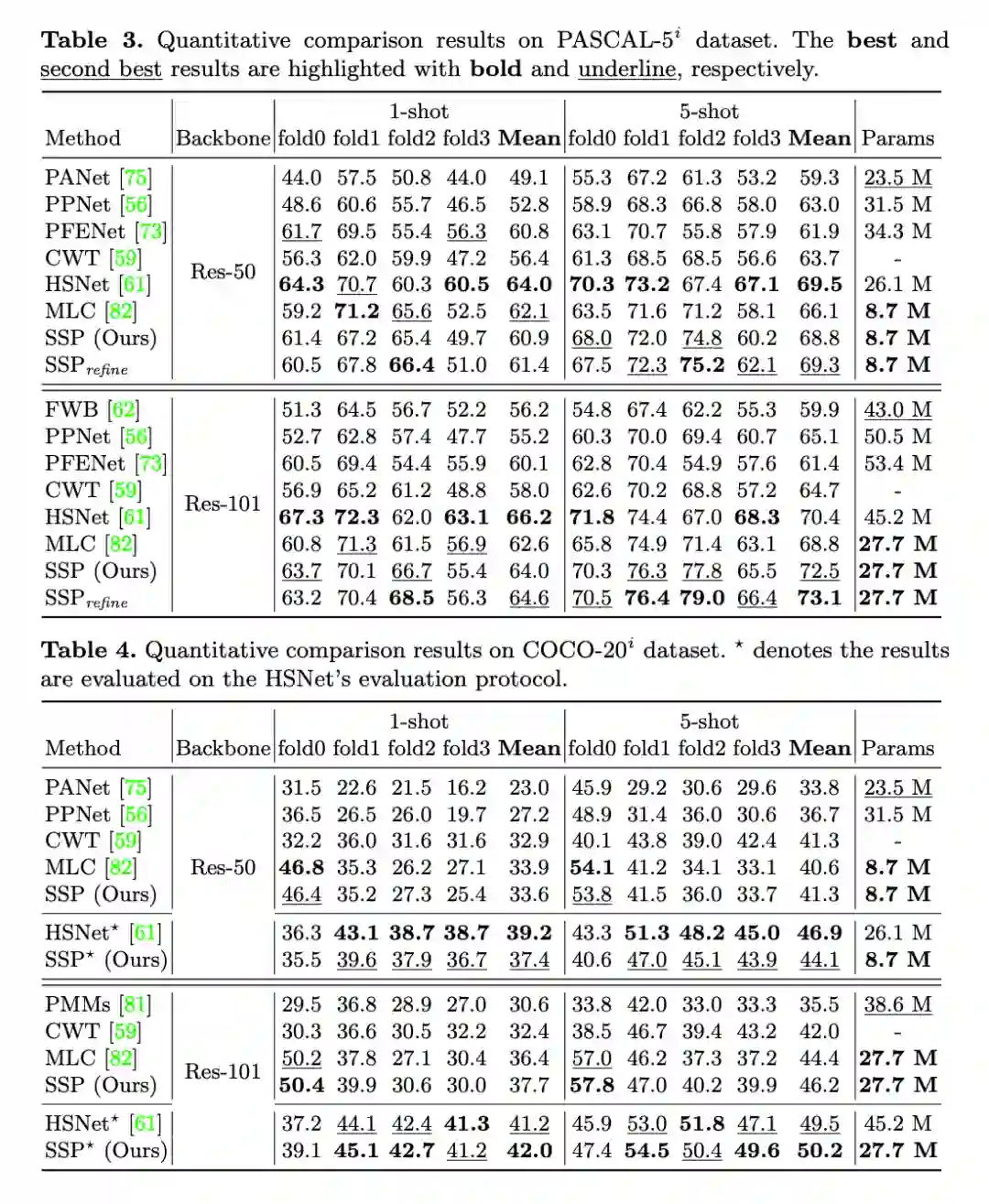 我们在 Pascal VOC,MS COCO 和 FSS-1000 三个数据集上进行了实验。如表 3 和表 4 所示,在使用 ResNet-101 backbone 和 5-shot support 的设置下,我们的方法取得了最好的性能,同时在其他设置下我们的方法也很有竞争力。我们发现 HSNet 的 evaluation protocol 更容易在 MS COCO 数据集上得到更好的结果,因此我们也使用 HSNet 的 evaluation protocol 来测评我们的算法。