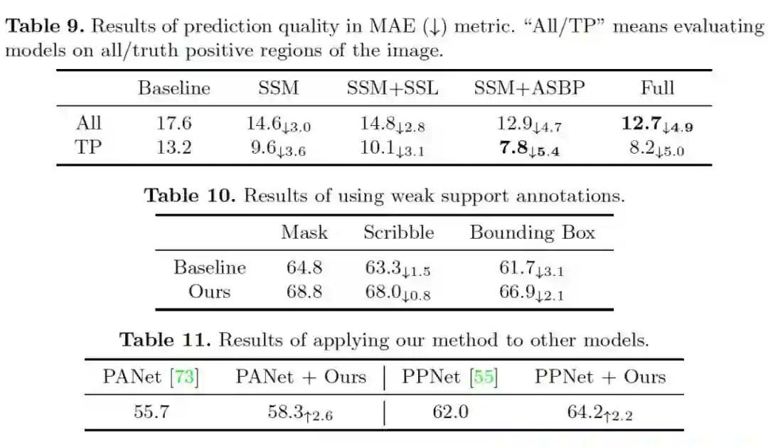 个优点是更高置信度的预测结果。分割算法会使用阈值将预测结果中的连续 [0,1] 值变为 0-1 值,但是初始的预测结果质量也很重要,尤其是对于困难样本。如果预测值在 0.5 附近,这个点上的预测就很容易失败。我们希望得到更加鲁棒和高置信度的预测结果。因此,我们使用 MAE 对预测结果的连续 [0,1] 值进行评估。如图9所示,我们的算法可以得到更低的 MAE,这意味着我们的预测结果具有更高的置信度。表 9 和表 10 显示我们的算法对其他形式的 support 标注也很鲁棒。
