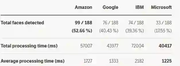 亚马逊能够检测到 52.66 % 的人脸,谷歌 40.43 %,IBM 39.36 %,微软甚至只有 17.55 %。