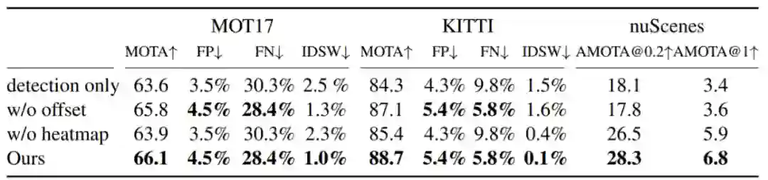 表 4:在 MOT17、KITTI、nuScenes 数据集上的控制变量研究。
