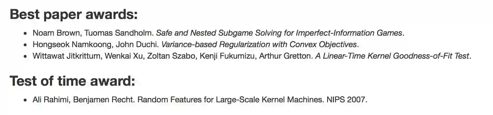 大会第一天,根据官网信息我们正式获知了今年的最佳论文等奖项。由于今年最佳论文的获奖者,来自卡耐基梅隆大学的 Noam Brown 与其导师 Tuomas Sandholm 早早地公布了自己的获奖信息(参见:NIPS 2017 最佳论文出炉:CMU 冷扑大师不完美信息博弈研究获奖),悬念就落到了另外几篇获奖论文上。
