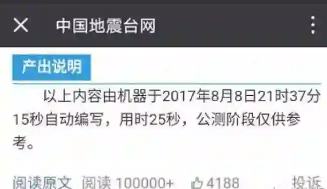 九寨沟地震后,全球第一条速报由机器人在8月8日21时37分15秒自动编写,全文585个字,仅花了25秒。