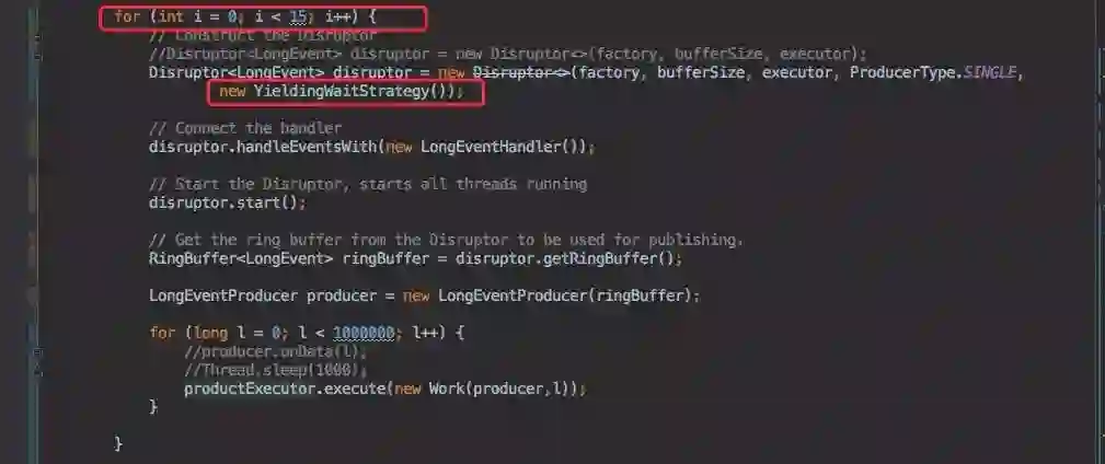 创建了 15 个 Disruptor 队列,同时每个队列都用线程池来往 Disruptor 队列里面发送 100W 条数据。