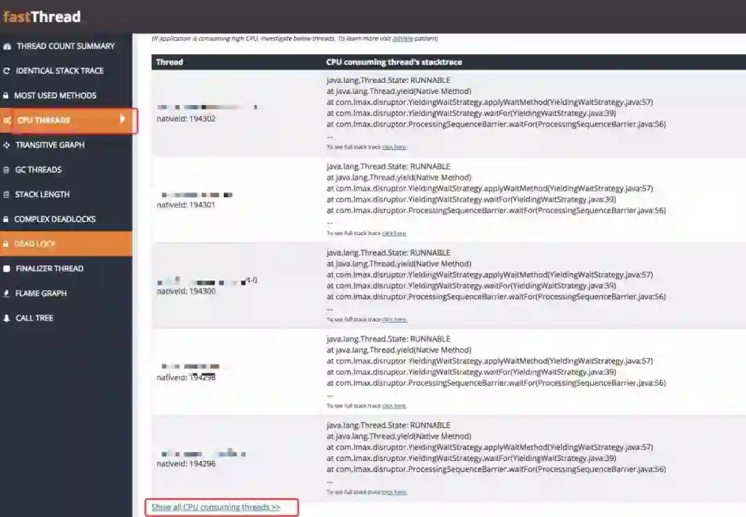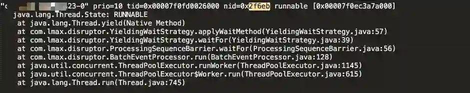 也就是说都是 Disruptor 队列的堆栈,同时都在执行 java.lang.Thread.yield 函数。