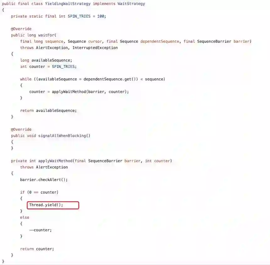 YieldingWaitStrategy 是一种充分压榨 CPU 的策略,使用自旋 + yield 的方式来提高性能。