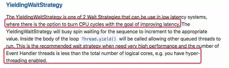 但留意到官方对 YieldingWaitStrategy 的描述里谈到:当消费线程(Event Handler threads)的数量小于 CPU 核心数时推荐使用该策略。