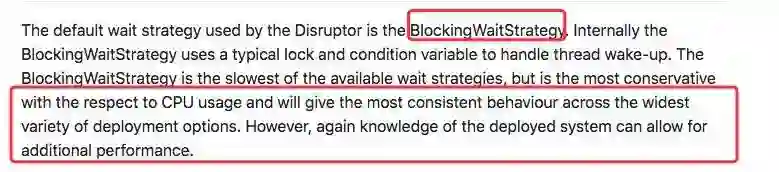同时查阅到其他的等待策略 BlockingWaitStrategy (也是默认的策略),它使用的是锁的机制,对 CPU 的使用率不高。