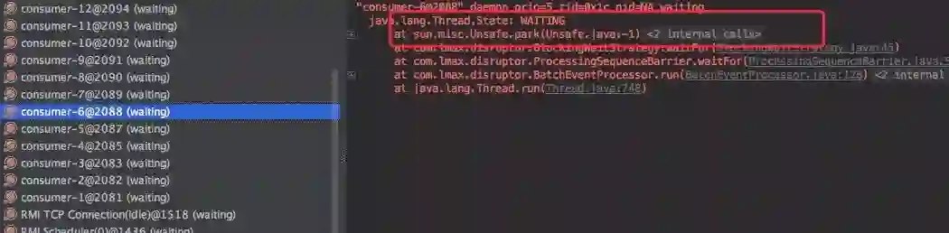 发现这是 Disruptor 的一个堆栈,前段时间正好解决过一个由于 Disruptor 队列引起的一次 OOM,没想到又来一出。