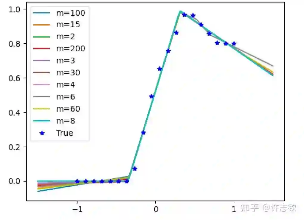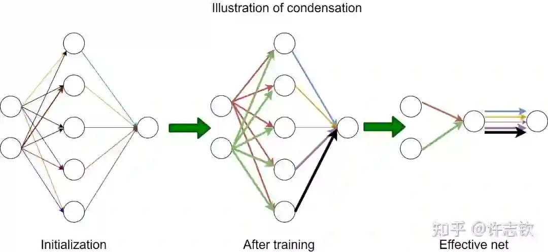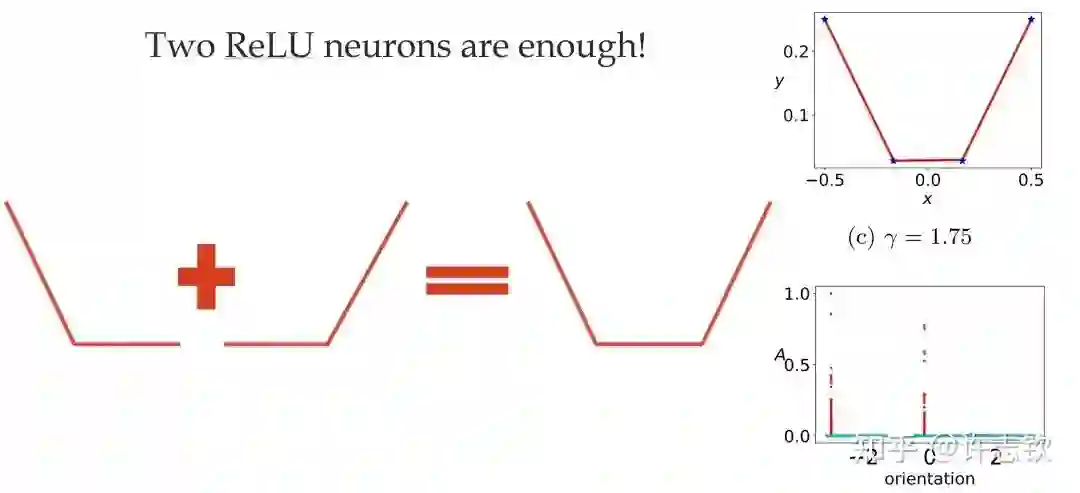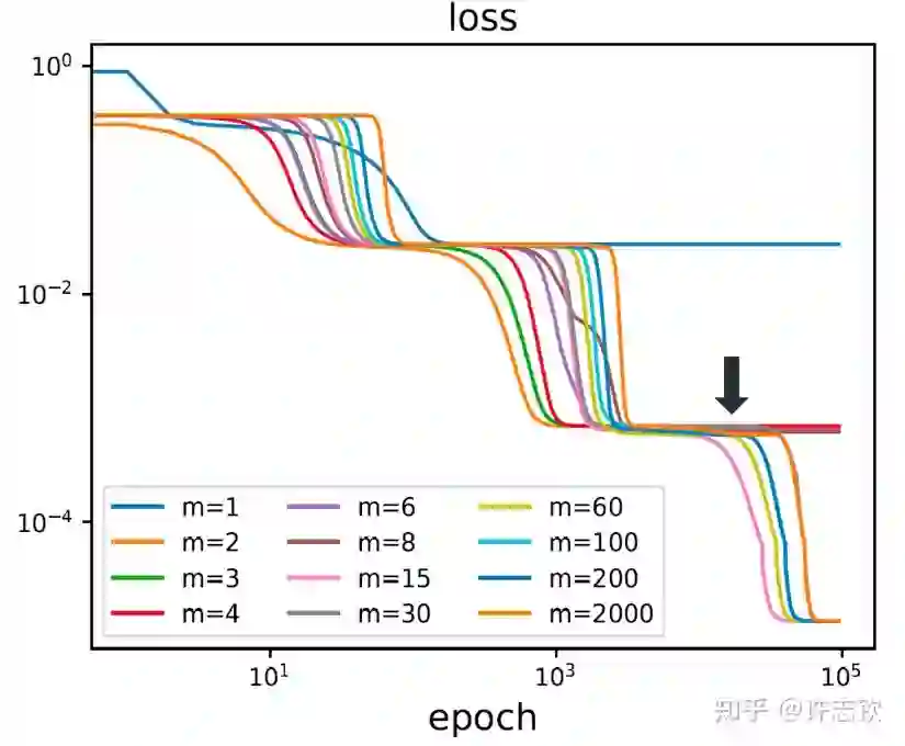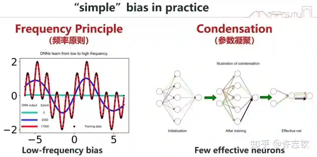 回顾在我们前面最开始提到的泛化迷团,以及我们最开始提出的问题“在实际训练中,神经网络真的很复杂吗?”,在参数凝聚的情况下,对于一个表面看起来很多参数的网络,我们自然要问:神经网络实际的有效参数有多少?比如我们前面看到的两层神经网络凝聚在两个方向的例子,实际上,这个网络的有效神经元只有两个。因此凝聚可以根据实际数据拟合的需求来有效地控制模型的复杂度。