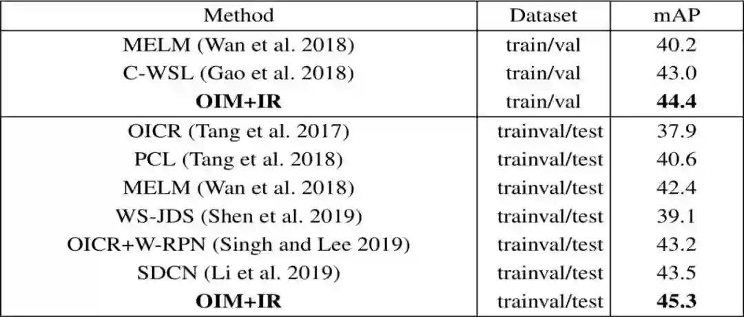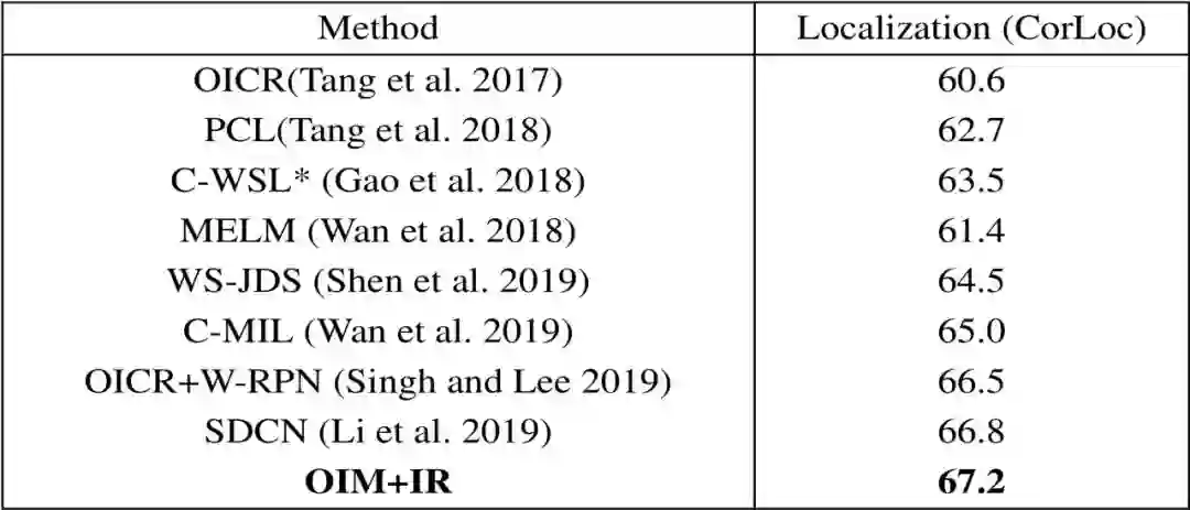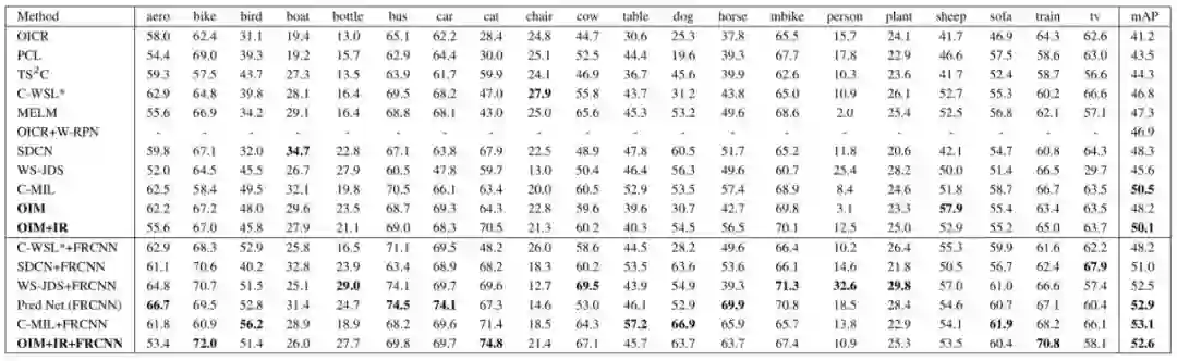 表2:OIM与其他目前最先进的方法在PASCAL VOC 2007训练验证集上定位精确度的比较(CorLoc) (%)