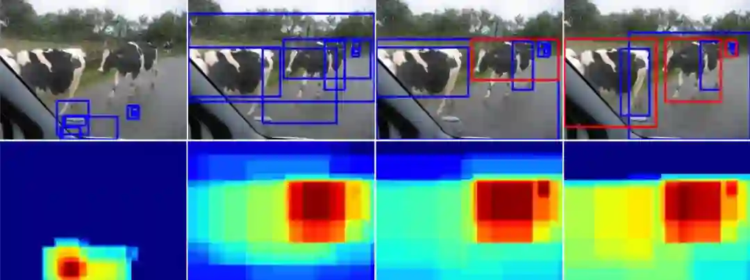 图3是检测奶牛的过程,第一张第一列是随机初始化的结果,网络还没进行学习;第二列至第四列是网络迭代的不同阶段(第一个迭代, 第三个迭代,和最后的迭代),可以看出,训练到一定阶段,算法不仅能检测出所有的奶牛,而且奶牛的检测框也越来越精确。