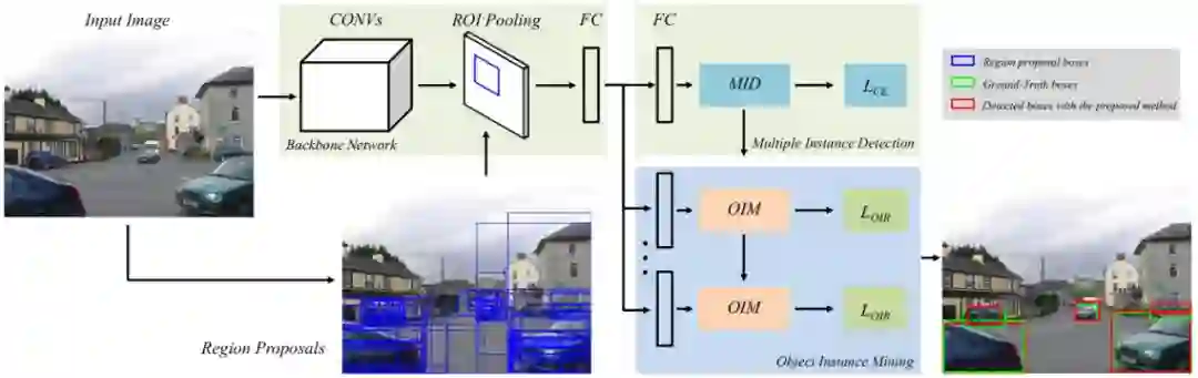 该目标检测框架主要由多实例检测(MID,Multiple Instance Detection)及目标实例挖掘(OIM,Object Instance Mining)两个部分构成,具体如下图1: