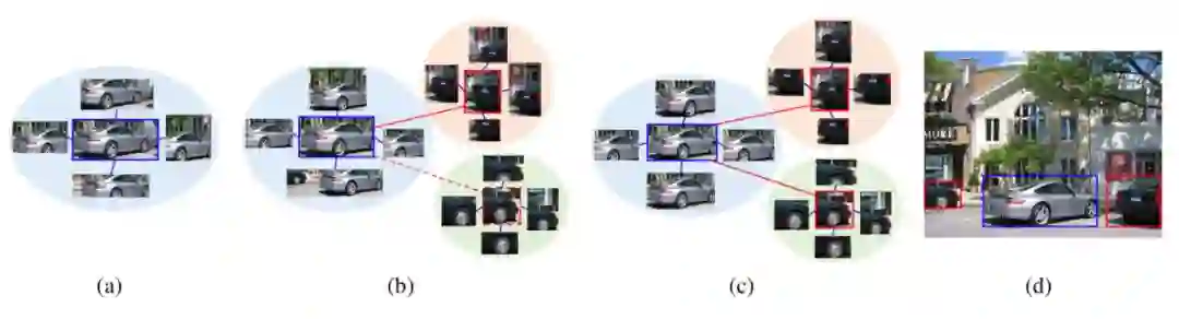基于外观相似度,可以计算它与其他候选框之间的外观相似度,挖掘图片中可能属于同一类别的物体实例,建立外观图,比如图b和c,通过外观相似度找到了另外两辆黑色车。