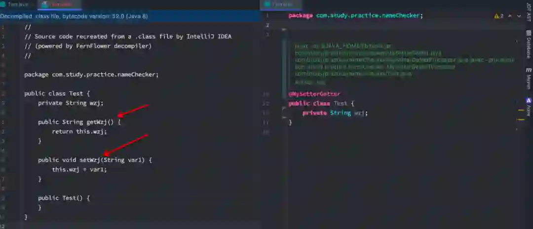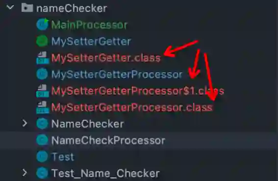 ("com.study.practice.nameChecker.MySetterGetter")(SourceVersion.RELEASE_8)public class MySetterGetterProcessor extends AbstractProcessor {// 主要是输出信息private Messager messager;private JavacTrees javacTrees;private TreeMaker treeMaker;private Names names;public synchronized void init(ProcessingEnvironment processingEnv) {super.init(processingEnv);this.messager = processingEnv.getMessager();this.javacTrees = JavacTrees.instance(processingEnv);Context context = ((JavacProcessingEnvironment)processingEnv).getContext();this.treeMaker = TreeMaker.instance(context);this.names = Names.instance(context);}public boolean process(Set<? extends TypeElement> annotations, RoundEnvironment roundEnv) {// 拿到被注解标注的所有的类Set<? extends Element> elementsAnnotatedWith = roundEnv.getElementsAnnotatedWith(MySetterGetter.class);elementsAnnotatedWith.forEach(element -> {// 得到类的抽象树结构JCTree tree = javacTrees.getTree(element);// 遍历类,对类进行修改tree.accept(new TreeTranslator(){public void visitClassDef(JCTree.JCClassDecl jcClassDecl) {List<JCTree.JCVariableDecl> jcVariableDeclList = List.nil();// 在抽象树中找出所有的变量for(JCTree jcTree: jcClassDecl.defs){if (jcTree.getKind().equals(Tree.Kind.VARIABLE)){JCTree.JCVariableDecl jcVariableDecl = (JCTree.JCVariableDecl)jcTree;jcVariableDeclList = jcVariableDeclList.append(jcVariableDecl);}}// 对于变量进行生成方法的操作for (JCTree.JCVariableDecl jcVariableDecl : jcVariableDeclList) {messager.printMessage(Diagnostic.Kind.NOTE, jcVariableDecl.getName() + " has been processed");jcClassDecl.defs = jcClassDecl.defs.prepend(makeSetterMethodDecl(jcVariableDecl));jcClassDecl.defs = jcClassDecl.defs.prepend(makeGetterMethodDecl(jcVariableDecl));}// 生成返回对象JCTree.JCExpression methodType = treeMaker.Type(new Type.JCVoidType());return treeMaker.MethodDef(treeMaker.Modifiers(Flags.PUBLIC), getNewSetterMethodName(jcVariableDecl.getName()), methodType, List.nil(), parameters, List.nil(), block, null);}/*** 生成 getter 方法* @param jcVariableDecl* @return*/private JCTree.JCMethodDecl makeGetterMethodDecl(JCTree.JCVariableDecl jcVariableDecl){ListBuffer<JCTree.JCStatement> statements = new ListBuffer<>();// 生成表达式JCTree.JCReturn aReturn = treeMaker.Return(treeMaker.Ident(jcVariableDecl.getName()));statements.append(aReturn);JCTree.JCBlock block = treeMaker.Block(0, statements.toList());// 无入参// 生成返回对象JCTree.JCExpression returnType = treeMaker.Type(jcVariableDecl.getType().type);return treeMaker.MethodDef(treeMaker.Modifiers(Flags.PUBLIC), getNewGetterMethodName(jcVariableDecl.getName()), returnType, List.nil(), List.nil(), List.nil(), block, null);}/*** 拼装Setter方法名称字符串* @param name* @return*/private Name getNewSetterMethodName(Name name) {String s = name.toString();return names.fromString("set" + s.substring(0,1).toUpperCase() + s.substring(1, name.length()));}/*** 拼装 Getter 方法名称的字符串* @param name* @return*/private Name getNewGetterMethodName(Name name) {String s = name.toString();return names.fromString("get" + s.substring(0,1).toUpperCase() + s.substring(1, name.length()));}/*** 生成表达式* @param lhs* @param rhs* @return*/private JCTree.JCExpressionStatement makeAssignment(JCTree.JCExpression lhs, JCTree.JCExpression rhs) {return treeMaker.Exec(treeMaker.Assign(lhs, rhs));}}