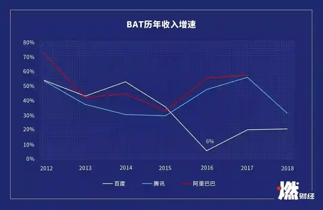 百度在2015年增速大降,2016年仅为6% 制图 / 燃财经
