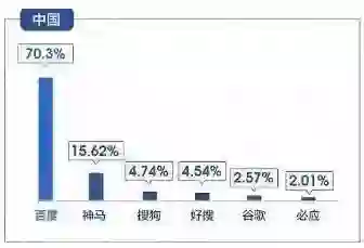 据Statcounter最近发布的中国移动搜索引擎市场份额报告,中国区搜索引擎市场份额排行中,百度独占鳌头,至今仍是国内搜索引擎巨头,市场份额高达70.3%。神马搜索市场份额提升至15.62%,搜狗搜索占4.74%,360搜索(好搜)占4.54%。