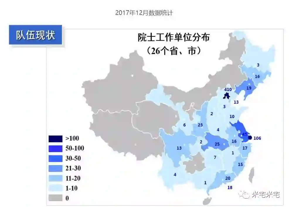 该图,深蓝色区域为科学院院士工作地数量最多的区域。北京410人,上海106人,江苏45人,湖北25人,陕西23人,广东20人,辽宁19人。这8个地区的院士能占到全体院士的81%。