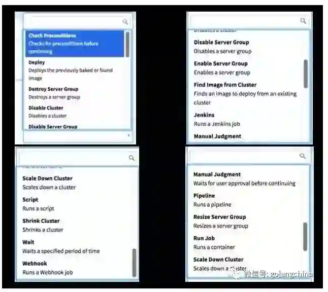 图 8 是 Pipeline Stages 的类型。左上 Check Precondltions 前置条件满足的时候才执行某个步骤。例如当前面的第一次发布里所有的实例都存活的时候,才执行某个步骤。或者当前面的步骤达到了某个状态,再执行下一个步骤。