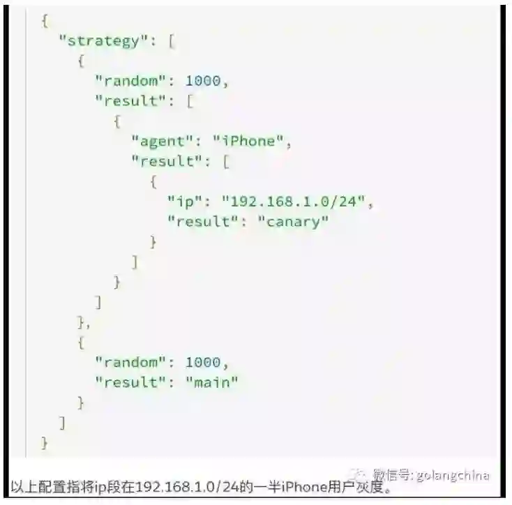 图上(图 19)是我们的 Canary 策略。这是我们自己实现的一套东西。就是说我们把这个网段一半的 IPhone 用户,首先它是 IPhone 用户,它的在这个网段,这个 1000 和这个 1000 有各自的权重,最终实现的结果在这个网段里一半的 IPhone 用户进行灰度,整个灰度的维度可以有很多。现在我们支持的是完全随机,要线上的 1%、2%,不管是谁,反正是随机的,可以支持从 IP 来的,可以支持是什么设备,是 IPhone 还是安卓,维度可以组合起来。
