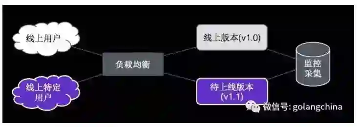 这个是 Canary 的意思,线上用户还是线上特定用户分成两组,线上用户访问老版本,特定用户通过负载均衡转发到特定的版本里,在后面有监控及和比较两个版本之间的差异。