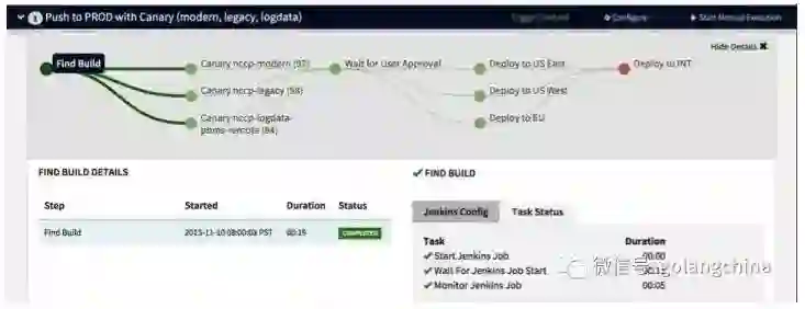 图 7是 Pipeline 的界面。首先,我觉得这个界面很好看。二是 Pipeline 可以做得非常灵活,可以说执行了前几个步骤之后,等所有的步骤执行完了再执行某个步骤。这个步骤是某个用户做某个审批,再分别执行三个步骤其中的一个步骤,然后再执行某个环节。也可以说要发布还是回退,发布是走发布的流程,回退就是回退的流程。总之在这个 Pipeline 里,你所期待的 Pipeline 的功能都可以提供。