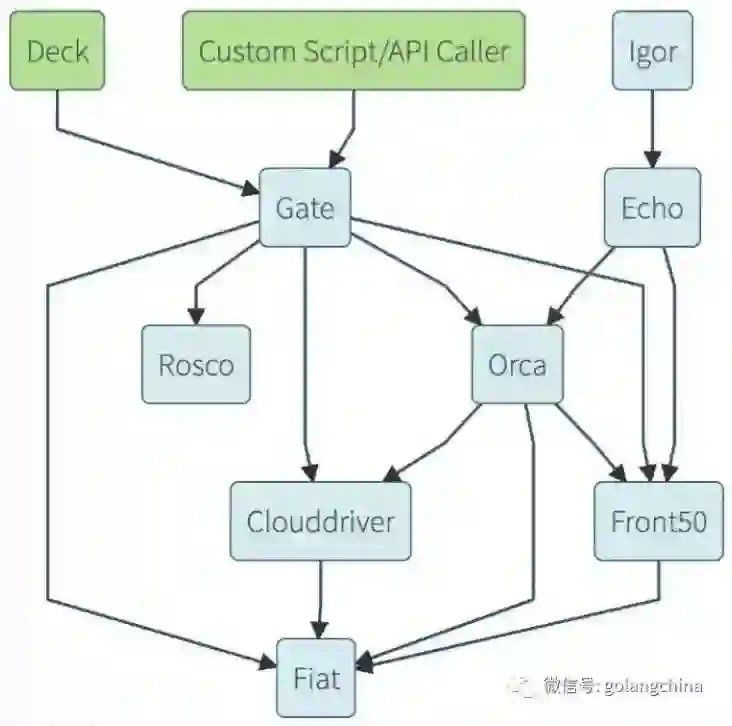 Gate 是它的一个 API 的网关,Rosco 是它做 beta 镜像构建的组件,Orca 是它的核心,所谓的流程引擎。Echo 是通知系统, igor是用来集成Jenkins等CI系统的一个组件。Front52 是存储管理,Cloud driver 是它用来适配不同的云平台的,比如Kubernetes 就有专门的Cloud driver,也有亚马逊的 Cloud driver。Fiat 是它一个鉴权的组件。
