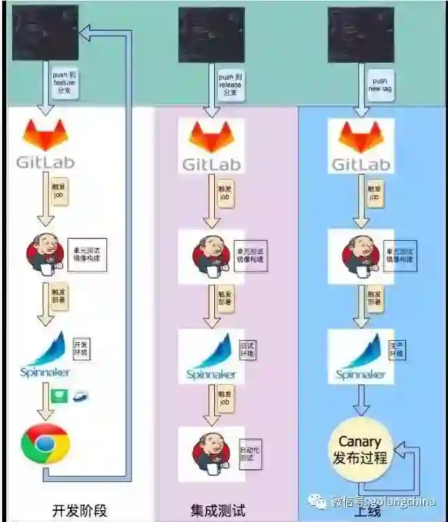 开发阶段,开发者在 UI 里 push,把东西推到 feature分支,这次开发迭代的时候领到一个任务,这个任务可以推到 feature 分支 。推到 feature 分支 之后,配置了一个 web hook,触发一个Jenkins job,这个 job 做单元测试和镜像构建,构建成一个 feature 分支 的镜像。生成之后这个新的镜像之后,触发 Spinnaker 的部署,这个部署只在开发环境里。