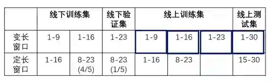 同样的道理,所以最终我们构造出了两个可行的窗口,如表一所示,第一个是变长窗口,线下训练集是1-9,1-16,线下验证集是1-23。线上训练集是1-9,1-16,1-23,线上测试集就是1-30。另一个是定长窗口,线下训练集是1-16,8-23(4/5),验证集是8-23(1/5),线上训练集是1-16,8-23,线上测试集是15-30。