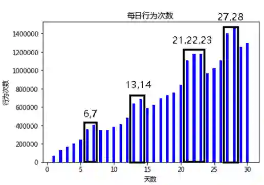 如图三所示,我们发现每天的行为次数从第一天开始每隔五天就会有两天突增,我们猜测这两天应该是周末,说明有个用户群在周末这两天比较活跃,而在周内相对活跃次数较少。这部分用户也许是上班族等,他们得生活规律有周期性。21,22,23这三天也比较多我们猜测是节假日三天。