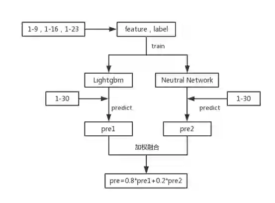 模型方面,主要对两个单模型进行单独训练,然后对其预测结果进行加权融合。由于Lightgbm模型和神经网络模型差异性大,一个是boosting的集成思想,一个是采用神经元激活的思想的,因此我们对其两个模型预测的结果进行加权融合,提升的效果会好。