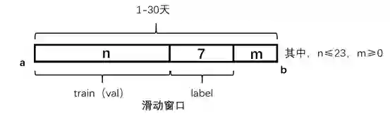 如图一所示,我们采用滑动窗口的算法思想,给定a到b,也就是1-30天区间,我们定义n和m,其中n是构造训练集或验证集的区间,紧接着的后7天是构造标签的区间。其中,n小于等于23,m大于等于0。这样满足这种条件的我们可以滑动出很多个窗口,理论上讲这样我们训练集的样本可以构造出很多个,但是经过仔细分析与思考,我们总结了窗口必须满足以下两个条件: