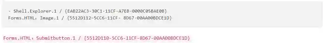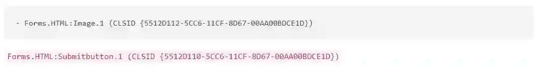 Microsoft Forms 2.0对象库包含许多可以在Office文档中使用的“HTML”ActiveX控件。这些控件标记为可安全初始化,并且不要求用户为嵌入它们的文档启用ActiveX。存储格式比Shell.Explorer.1对象简单得多。本质上,它由对象的CLSID和HTML片段(UTF-16编码)组成。HTML片段不一定必须格式正确,对象只会搜索它支持的属性。两个对象支持action属性,该属性采用URL。这些对象是: