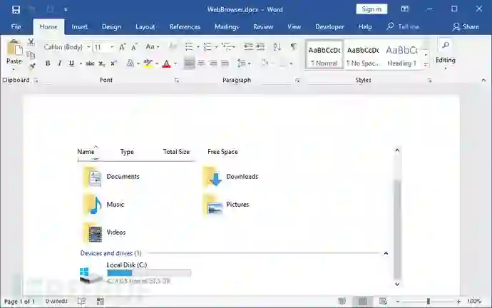 提供文件夹路径时,该对象的行为类似于Windows资源管理器。可以浏览文件或文件夹,甚至可以通过双击来执行文件。攻击者可能会滥用此功能来嵌入Windows资源管理器。如果攻击者可以说服其受害者双击攻击者控制的文件,则可以远程运行可执行代码。 但是这种攻击似乎很难实现。首先,OLE对象需要单击才能激活,其次,用户需要双击OLE对象才能实际获得可用的Windows资源管理器视图。最后,用户还需要双击Windows资源管理器视图中的文件。 在管理员限制浏览某些文件夹或驱动器的可能性的情况下,嵌入Windows资源管理器对象会很方便。例如,如果限制对C:驱动器的访问,则本地用户可以使用包含嵌入式Windows资源管理器的Office文档来规避此限制。此外,该对象可用于窃取NetNTLM哈希值,但由于这对Office文档并不难,因此使用单击的OLE对象进行激活是没有意义的。