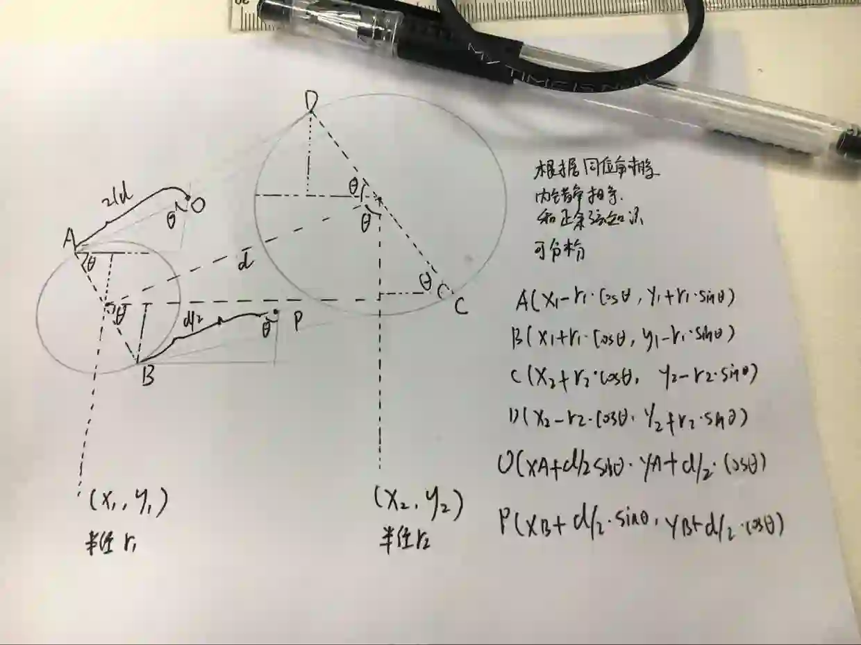 CGPoint pointD = CGPointMake(x2 - r2 * cosθ, y2 + r2 * sinθ);