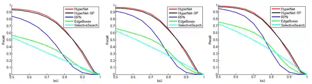 图4 在VOC 2007测试集的Recall和IoU阈值。Left:50个区域后选,Middle:100个区域后选;Right:200个区域后选。