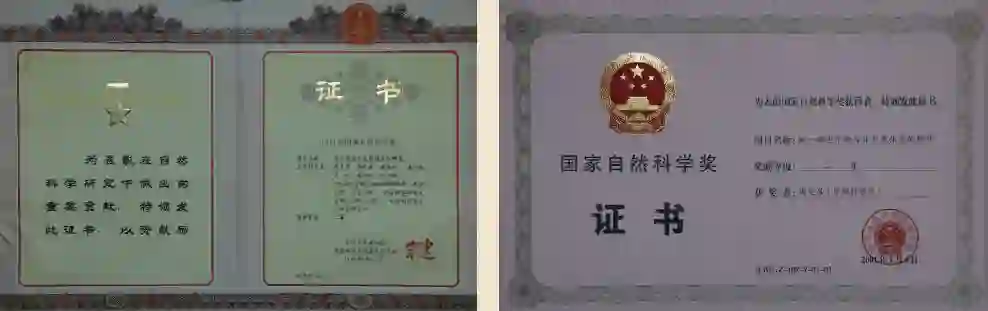 图3 周光召获1989 年国家自然科学二等奖(量子场论大范围性质的研究)和2001 年国家自然科学二等奖(统一描述平衡与非平衡体系的格林函数理论研究)