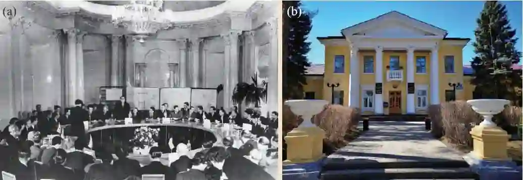 图1 (a)联合原子核研究所成员国政府全权代表会议(1956.3.26),图片引自Joint Institutefor Nuclear Researc-Yesterday,Today,Tomorrow;(b)联合原子核研究所主楼