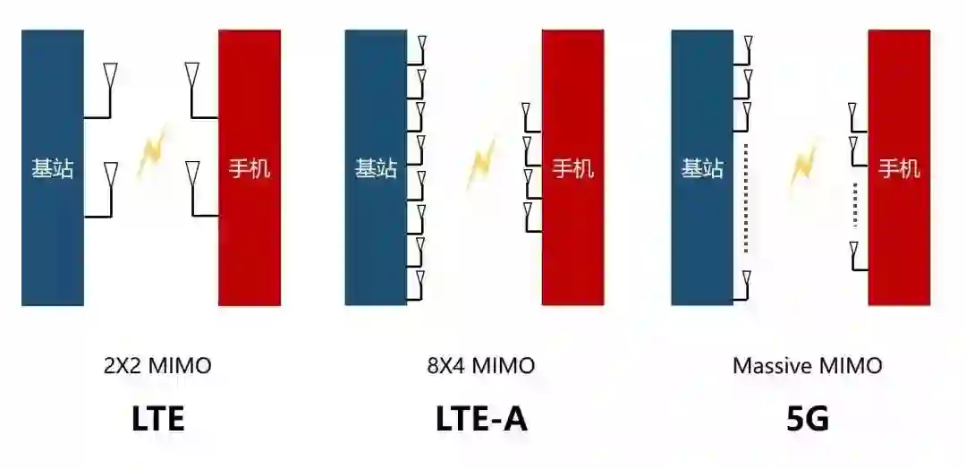 MIMO就是“多进多出”(Multiple-Input Multiple-Output),多根天线发送,多根天线接收。在LTE时代,我们就已经有MIMO了,但是天线数量并不算多,只能说是初级版的MIMO。