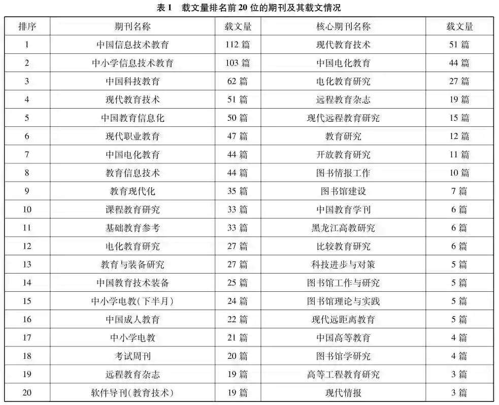 对创客教育研究文献的来源期刊及期刊载文量进行统计分析发现,刊物种类有775种,其中CSSCI期刊70种,占比9.03%。将载文量前20的全部期刊和CSSCI期刊分别进行排序,具体见表1。根据载文数量统计,载文量前20的全部期刊中只有《现代教育技术》、《中国电化教育》、《电化教育研究》和《远程教育杂志》4种CSSCI期刊,占比为20%。通过对期刊的载文量情况分析,从整体上看,我国创客教育研究文献具有较大的学术价值和参考价值,但研究质量和水平仍然存在较大的上升空间。20种CSSCI期刊中,有6种图书情报学期刊,这表明除了教育界之外,图书馆界在创客教育研究方面也占据着一席之地。