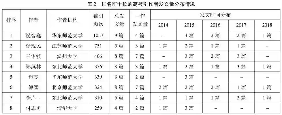 通过统计分析高被引作者及其论文发现:(1)华东师范大学祝智庭于2015年发表的《创客教育:信息技术使能的创新教育实践场》[9]以及江苏师范大学杨现民于2015年发表的《创客教育的价值潜能及其争议》[3]两篇文献被引频次都高达500余次,对创客教育研究产生深刻影响;(2)祝智庭、郑燕林、傅骞、李卢一四位学者近年来已连续数年产出相关研究成果,这表明创客教育研究已经成为四位学者的主要研究领域之一;(3)前十位高被引作者中有七位作者来自华东师范大学、江苏师范大学、东北师范大学以及北京师范大学等四所师范高校,并且被引频次排名前五位的作者中有四位来自师范高校,表明我国创客教育研究正由师范高校引领;(4)前十位高被引作者中有三位来自温州地区,这说明温州地区高校在创客教育研究领域具有举足轻重的地位,是我国创客教育研究的突出力量。
