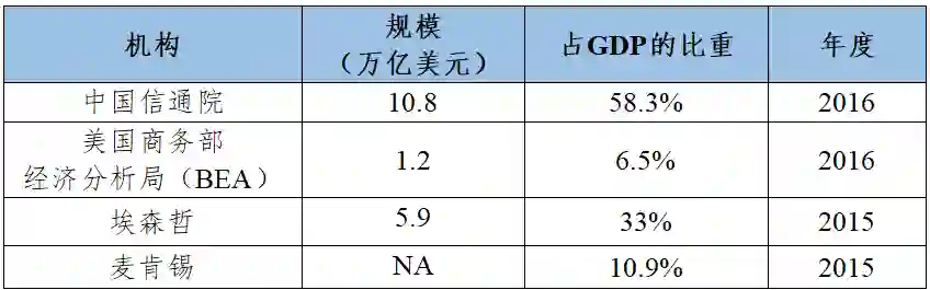 咨询公司埃森哲和麦肯锡对美国2015年的数字经济占GDP的比重进行了测算,结果分别为33%和10.9%,两者差距十分明显。如下表所示。