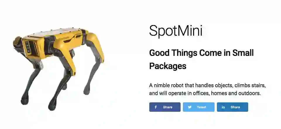 根据波士顿动力官网介绍,Spot Mini高84厘米,重30公斤,有效载荷14公斤,使用3D视觉系统,主要应用于运输,并且能够爬楼梯,适合在家庭、办公室和户外等多种场景。