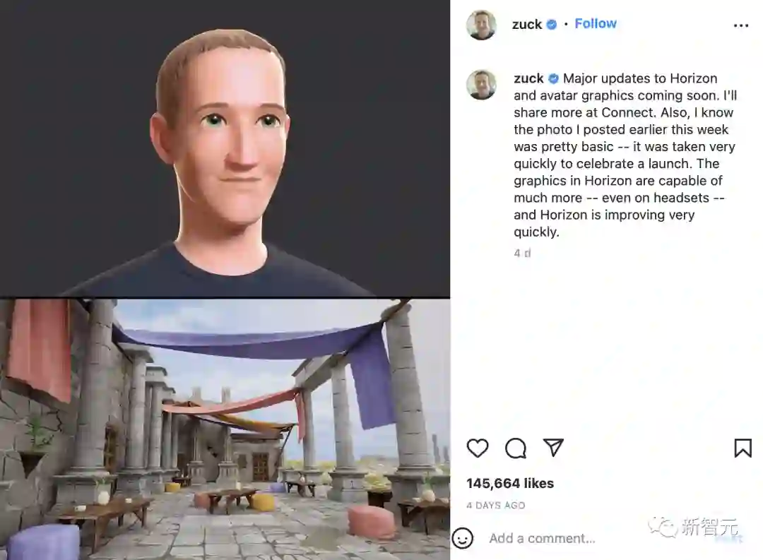 面对着潮水般的嘲讽,小扎再接再厉,几天后火速在Facebook和Ins上传了新头像,并一同发布了「画质」提升版的Horizon Worlds截图。