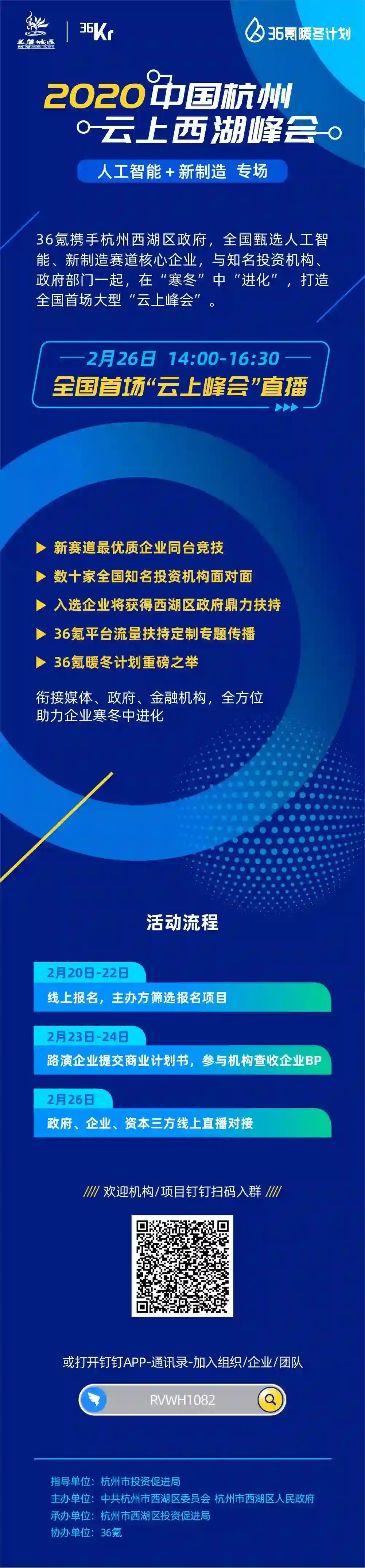 2月26日,全国首场云上峰会——“2020中国杭州云上西湖峰会”将在线上举行。本次峰会,36氪携手杭州西湖区委区政府,集结前沿赛道优质企业、知名投资机构,以资源聚合为手段,项目发掘为根本,聚焦新制造、人工智能产业在“寒冬”中的“进化”与发展趋势。“2020中国杭州云上西湖峰会”以36氪未来直播室为主要承载平台,充分宣传地方产业优势、创新成果、政府政策,帮助政府招商引资。并通过线上零接触、零成本对接,实现企业家、投资人和创业者的聚集和资源的高效链接。云上西湖峰会由杭州市投资促进局作为指导单位,由杭州市西湖区委区政府主办,杭州市西湖区投资促进局承办,36氪协办。
