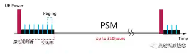 PSM即低功耗模式,是3GPP R12引入的技术,其原理是允许UE在进入空闲态一段时间后,关闭信号的收发和AS(接入层)相关功能,相当于部分关机,从而减少天线、射频、信令处理等的功耗消耗。借图: