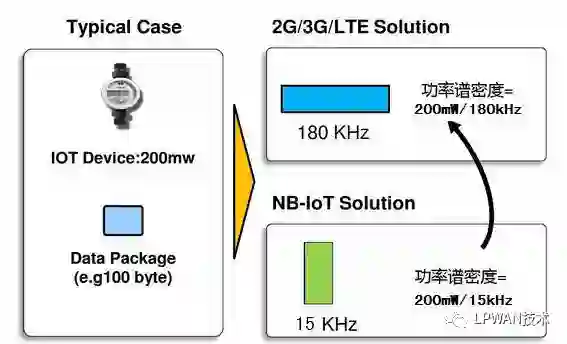 也就是NB-IoT单位带宽所携带的能量比2G/3G/4G更高,因此同等情况下可覆盖更远距离。