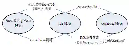那么UE处理完数据之后,什么时候进入PSM模式呢?这是由另一个定时器Activer Timer(T3324,0-255秒)决定的。UE处理完成数据之后,RRC连接会被释放、进入空闲态,与此同时启动Active Timer,此Timer超时后,UE即进入上述PSM模式。转换状态如下(借图):
