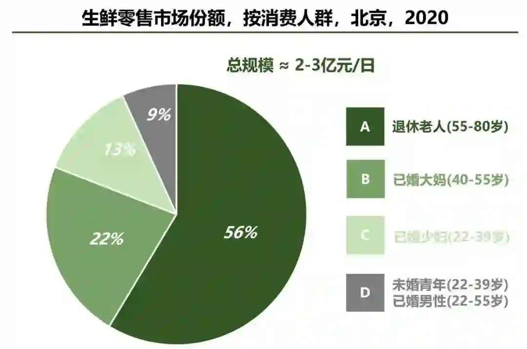 盒马从2015年内部立项到今天(图3),从来不是做旧改,也不是模仿抄袭。在展开之前,先用几个数据看下整个生鲜零售和盒马业态的人群画像(图4-图6)。图4把所有生鲜电商模式按核心年龄段、配送时效、价格定位、线上单量规模等指标放一起比较,盒马在切青年人群(18-39岁)上优势明显,而社区团购主打的低价平质生鲜切中了高频买菜人群(30-60岁)。高频买菜人群是个不可忽视的群体,图5是北京地区的情况,中老年人占近8成,且越往低线城市,中老年占比会更高,他们既是家庭日常买菜和日用品的核心决策者,也是传统大卖场的高复购人群,但弊端在于,此群体对日百、烟酒、母婴、休食、消费电子等的需求不断被拼多多瓜分,最终离卖场的最佳品类贡献结构越走越远。