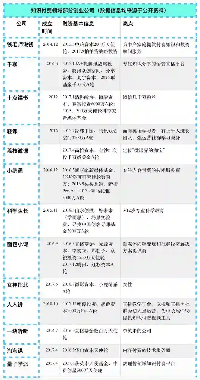 最后,我们梳理了知识付费行业的创业项目,并简要说明了它们各自的亮点,供投资人、创业者参考。