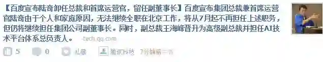 百度现任总裁兼首席运营官陆奇由于个人原因不能再担任这两个职位,他将在7月份卸任,到时候只担任副董事长职位。